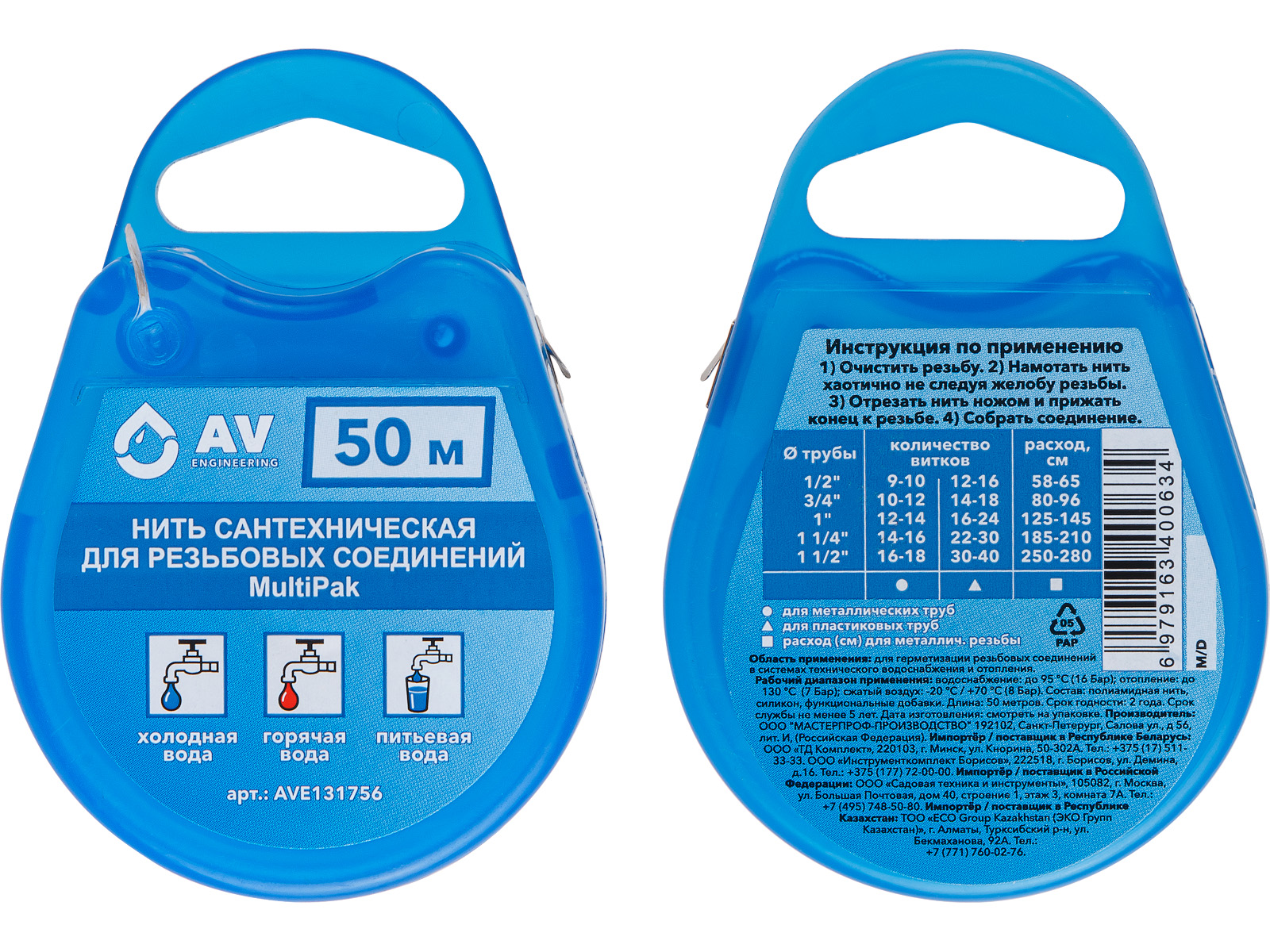 Нить сантехническая для резьбовых соединений MultiPak 50 м, AV Engineering